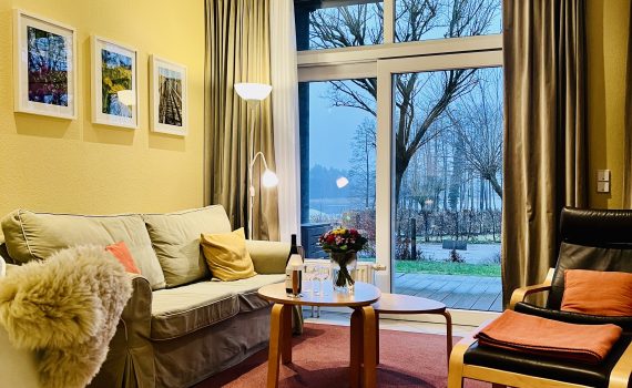 Die Eckwohnung befindet sich im Erdgeschoss des Aparthotels Seepanorama, dessen MirowSpa mit Schwimmbad, Saunalandschaft und Fitnessbereich mitgenutzt werden darf.